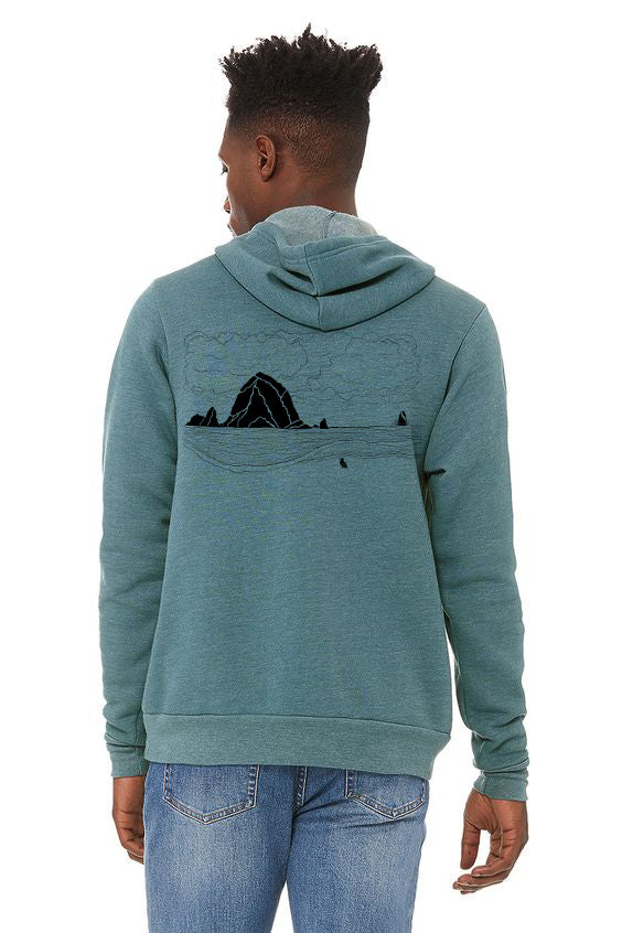 Back of hoodie: A bit of ocean magic. This drawing was inspired by one of the most famous Sea stack formations ever, Haystack Rock in Cannon Beach, Oregon. One of the regular visitors to Haystack Rock is the Tufted Puffin, seen here gazing at his beloved roost. In the distance a visiting Humpback waves hello & the clouds smile above it all.